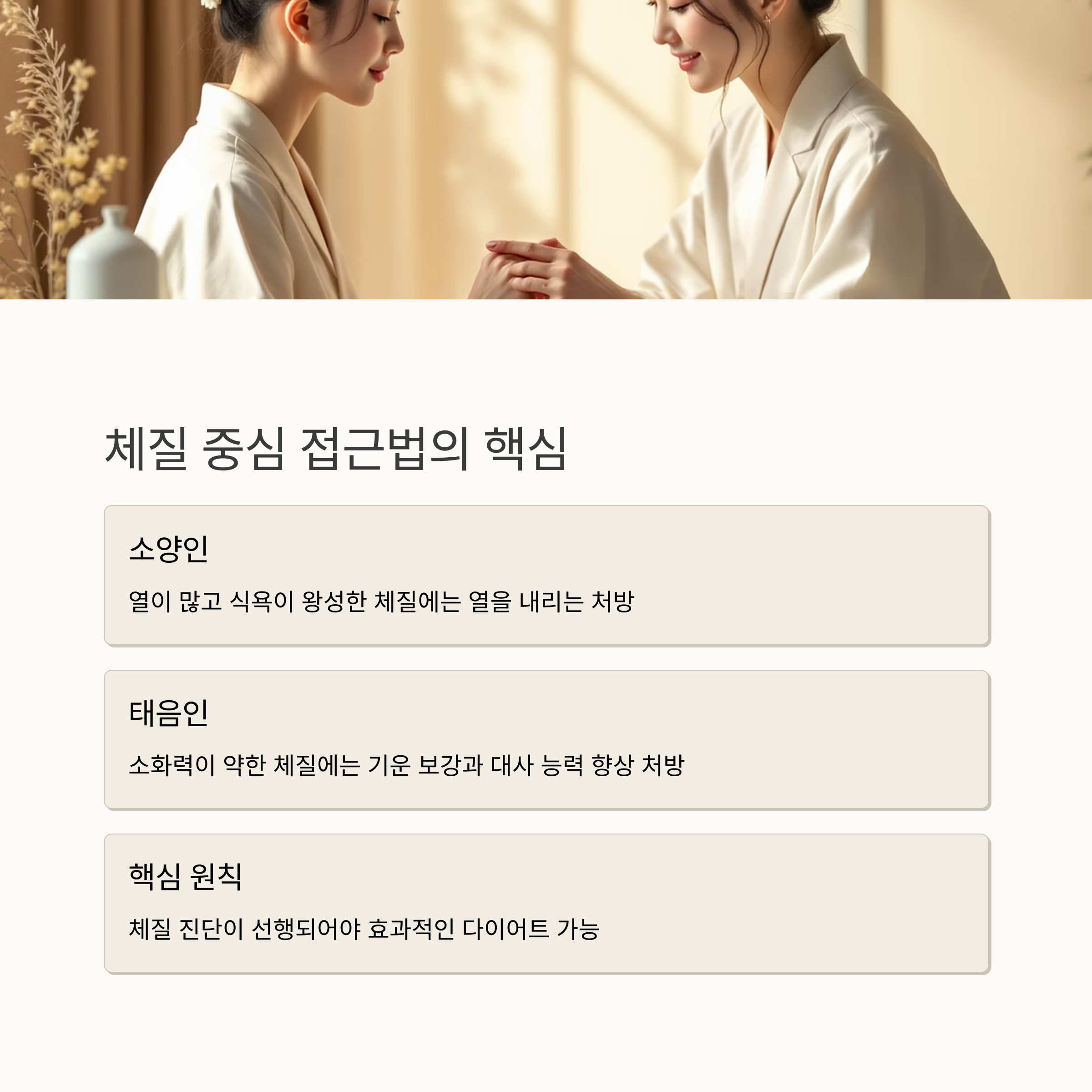 비만의 원인을 체질에서 찾고, 몸의 불균형을 바로잡는 방식으로 접근합니다.