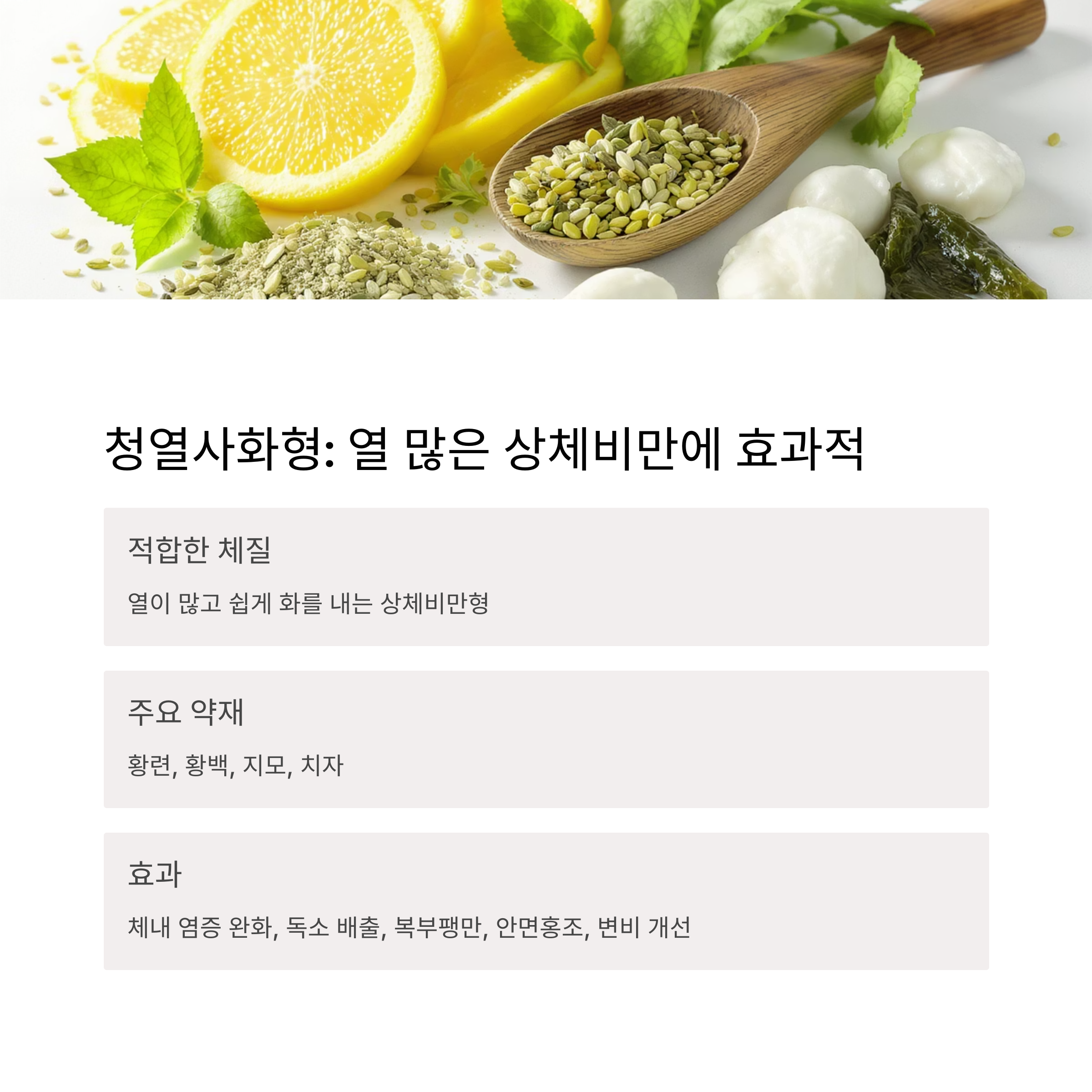 주로 상체비만이나 성격이 급한 사람에게 맞으며, 체내 염증과 독소 배출에 중점을 둡니다.
