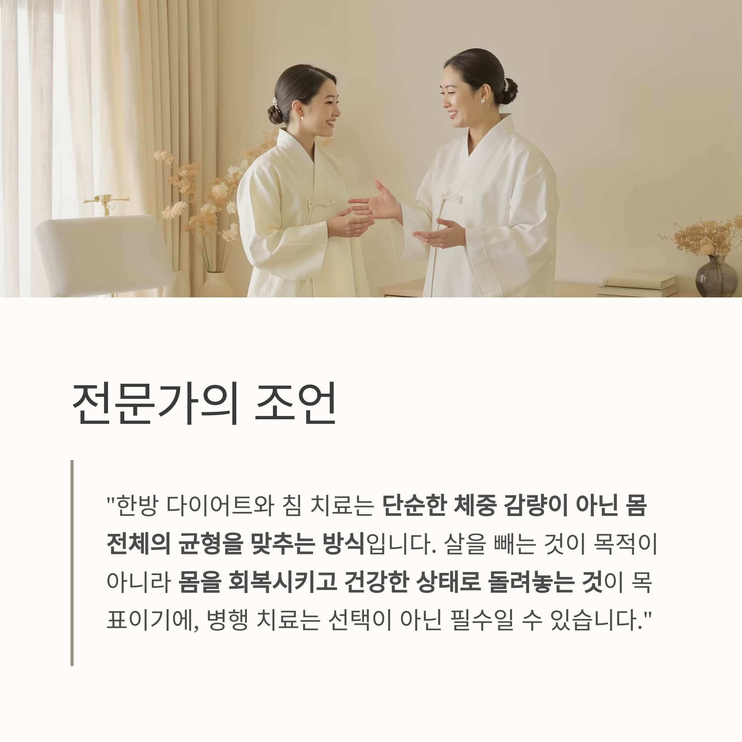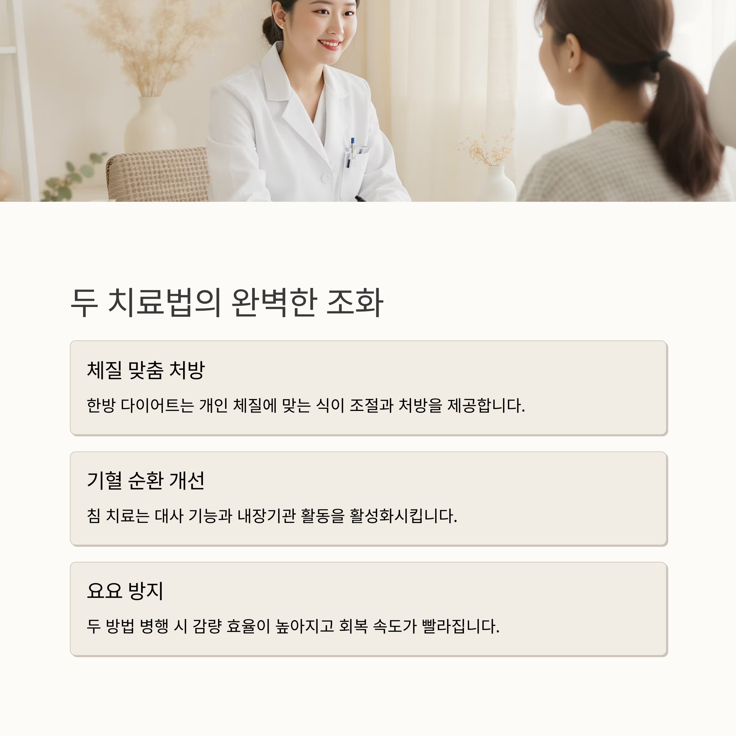 "한방 다이어트와 침 치료는 단순한 체중 감량이 아닌 몸 전체의 균형을 맞추는 방식입니다.