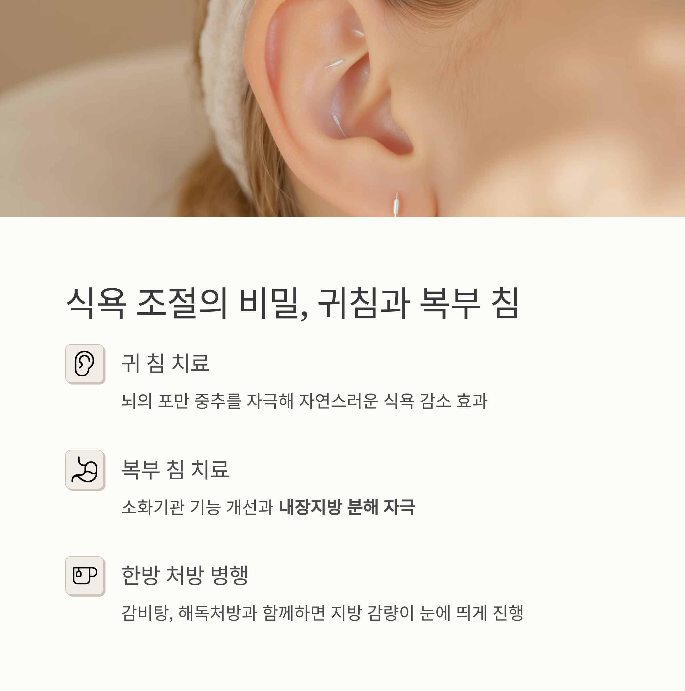 귀의 특정 혈자리에 침을 자극하면, 식욕이 자연스럽게 감소하고 군것질 욕구가 줄어들게 됩니다.
