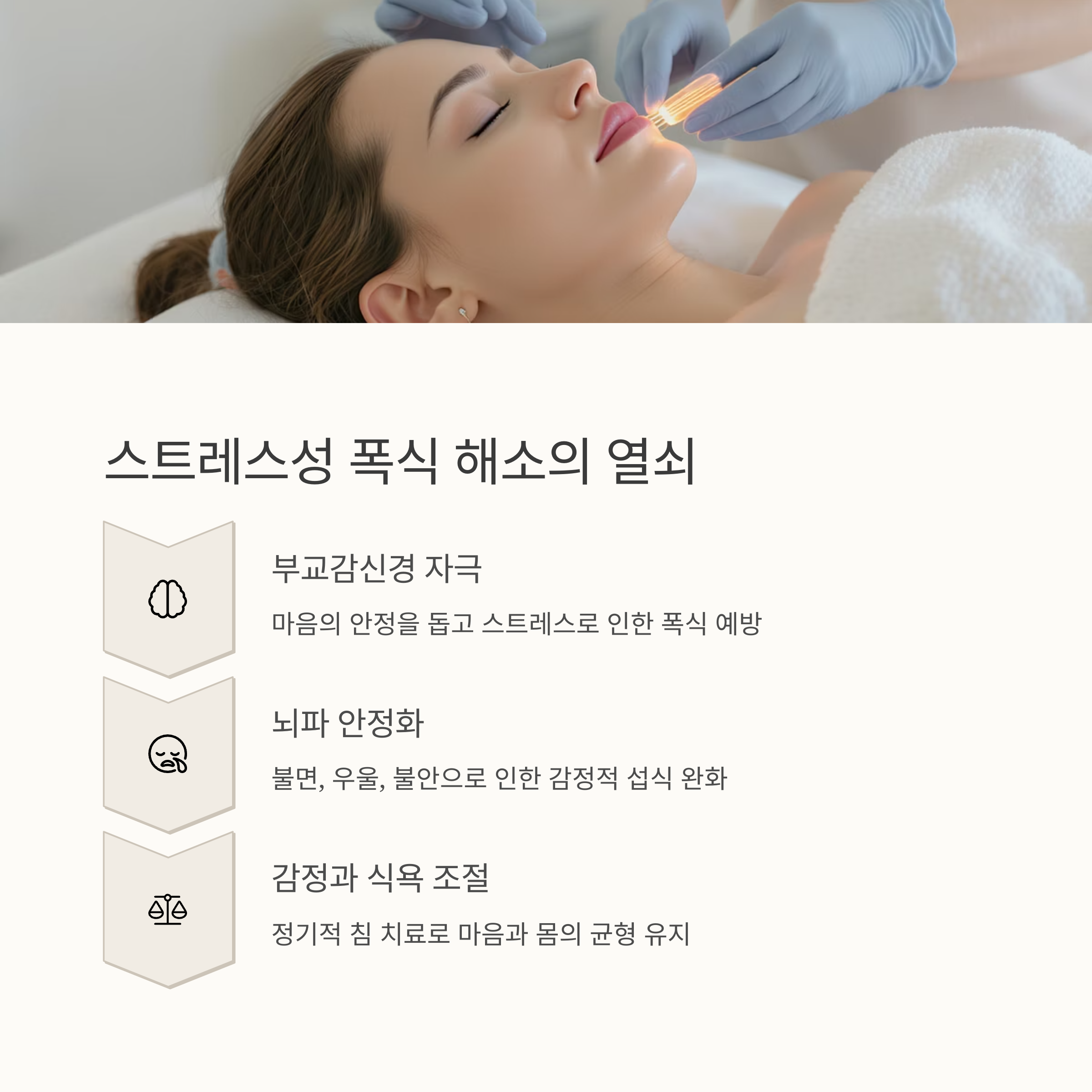 특히 불면, 우울, 불안으로 인한 감정적 섭식이 반복되는 경우 침 치료는 뇌파를 안정화시켜 감정 기복을 완화시키는 역할을 합니다.