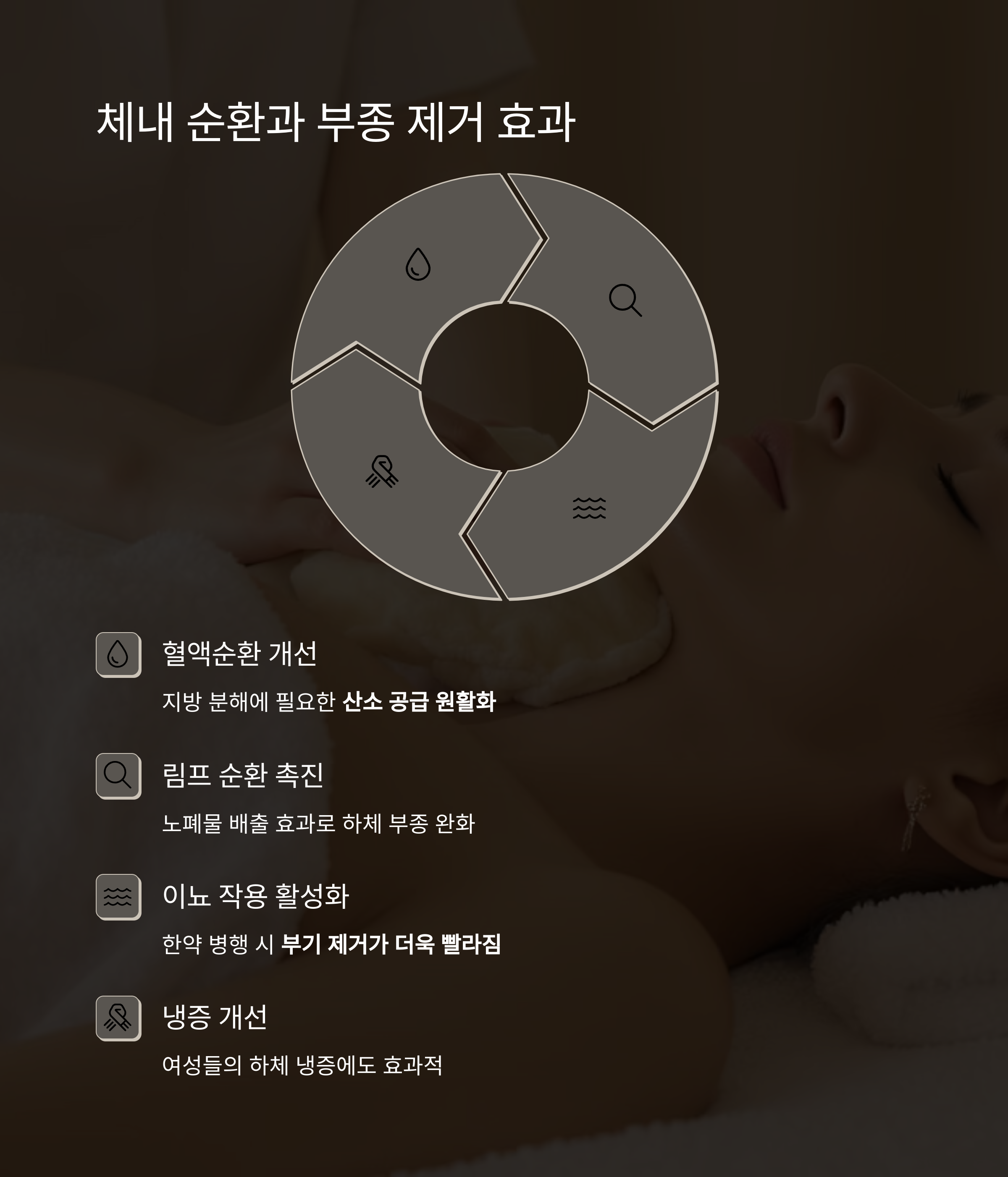 침은 혈자리의 기혈 순환을 도와 지방 분해에 필요한 산소 공급과 노폐물 배출을 원활하게 해주며, 특히 여성들의 하체 부종이나 냉증에도 효과적입니다.