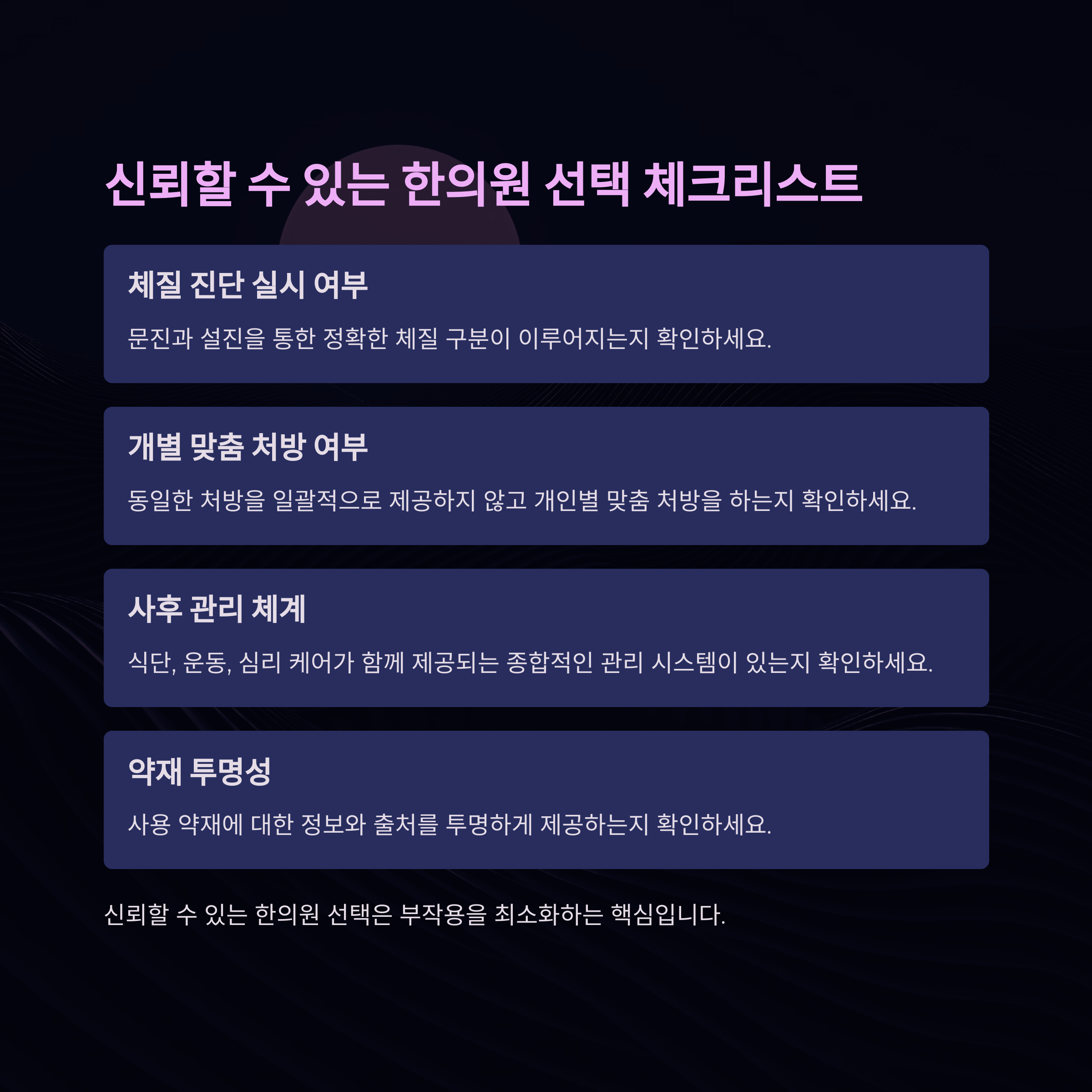 신뢰할 수 있는 한의원 선택은 부작용을 최소화하는 핵심입니다.