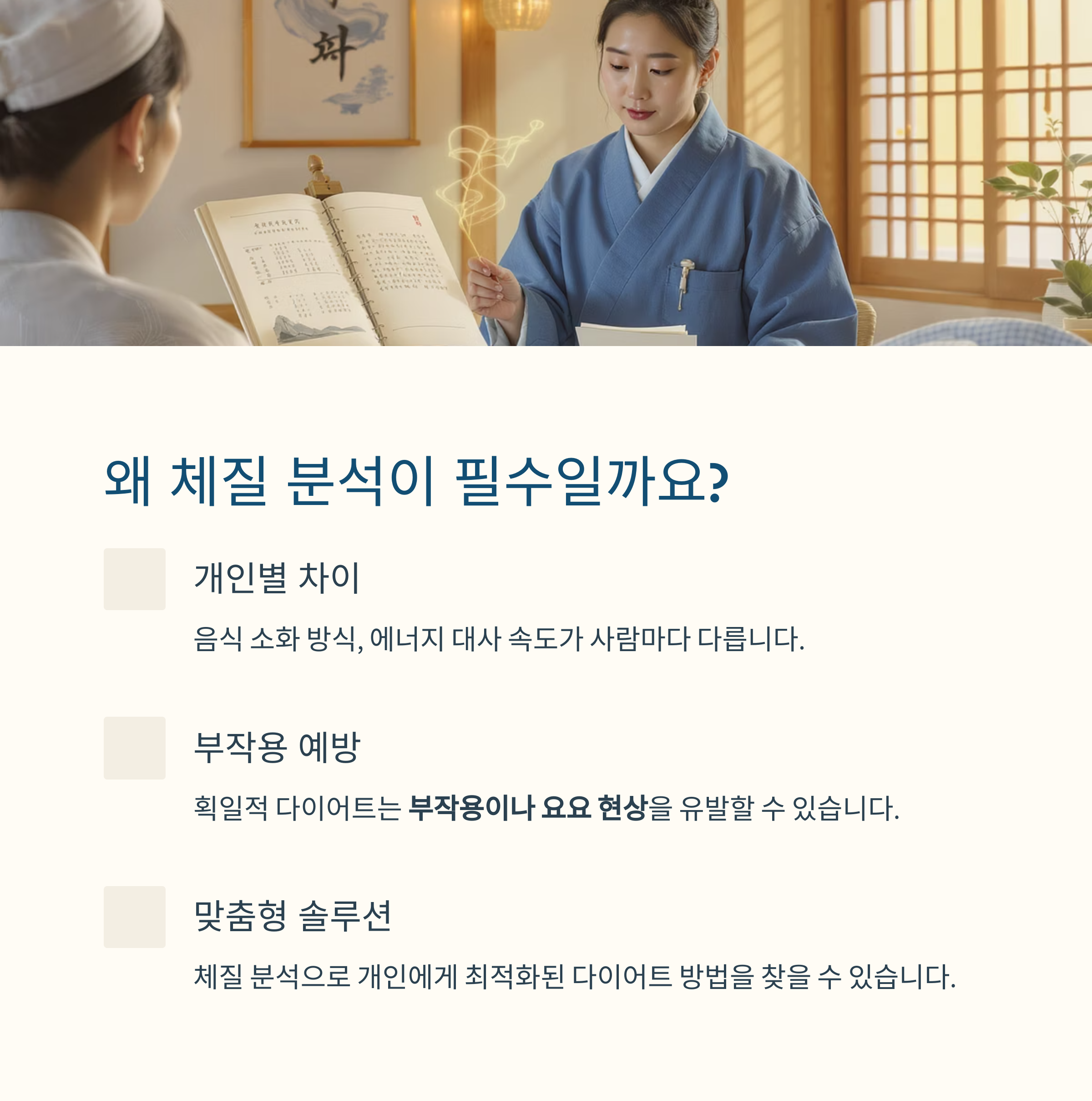 또한 소양인처럼 열이 많은 체질은, 지방을 연소하기 위해 고단백 식단을 사용하는 것이 오히려 체열을 상승시켜 피부 트러블이나 불면증을 유발할 수 있습니다. 이런 오류를 방지하기 위해 정확한 체질 분석은 필수입니다.