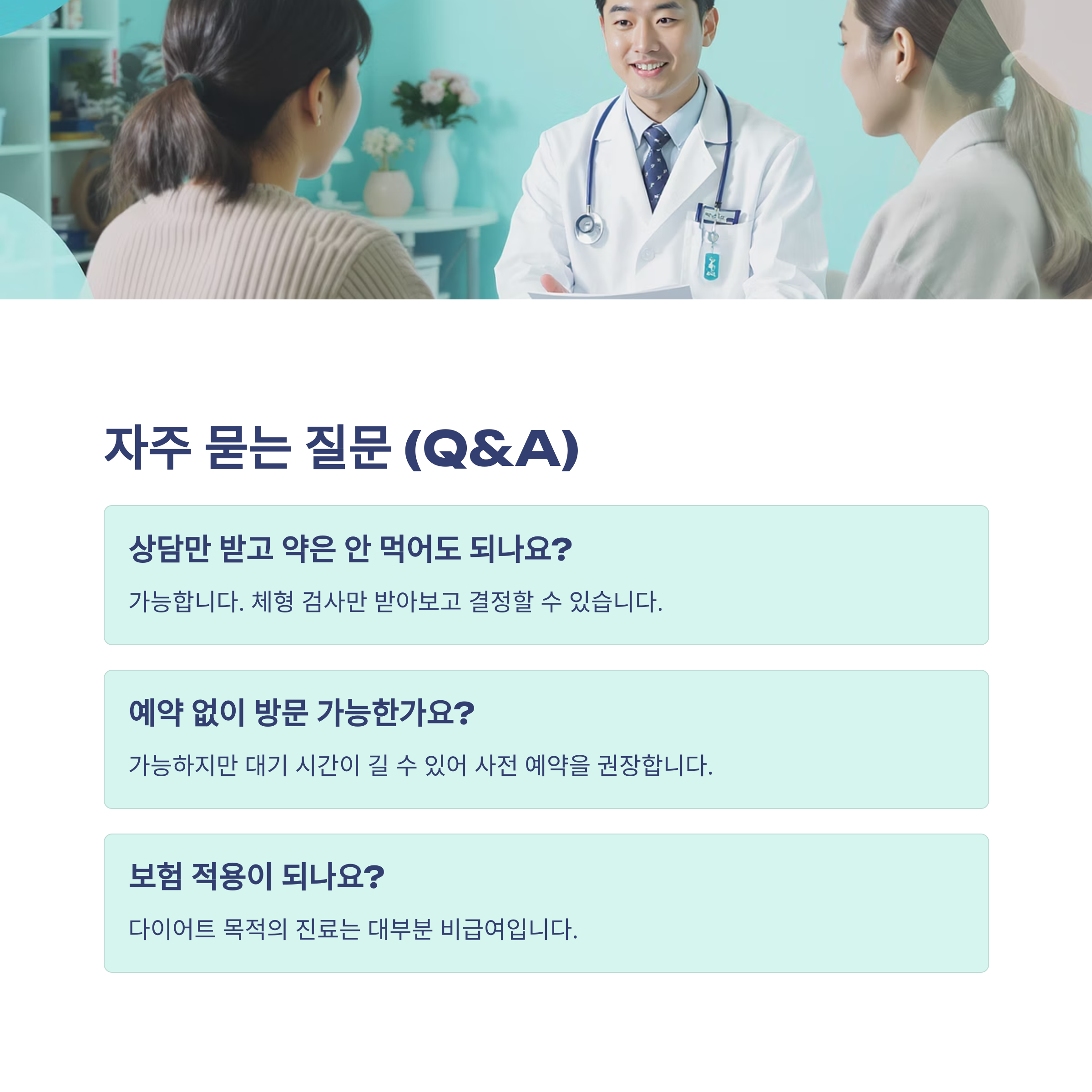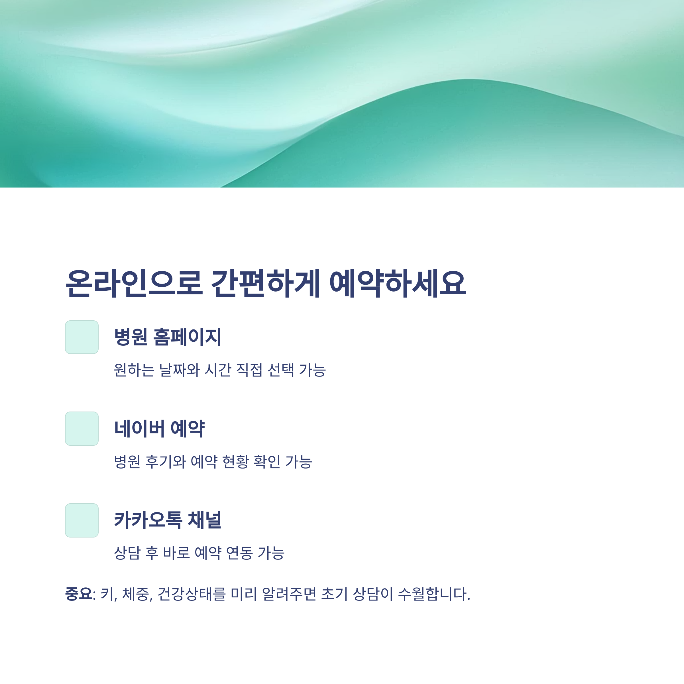 중요: 예약 시 키, 체중, 최근 건강상태를 미리 알려주면 초기 상담이 훨씬 수월합니다.