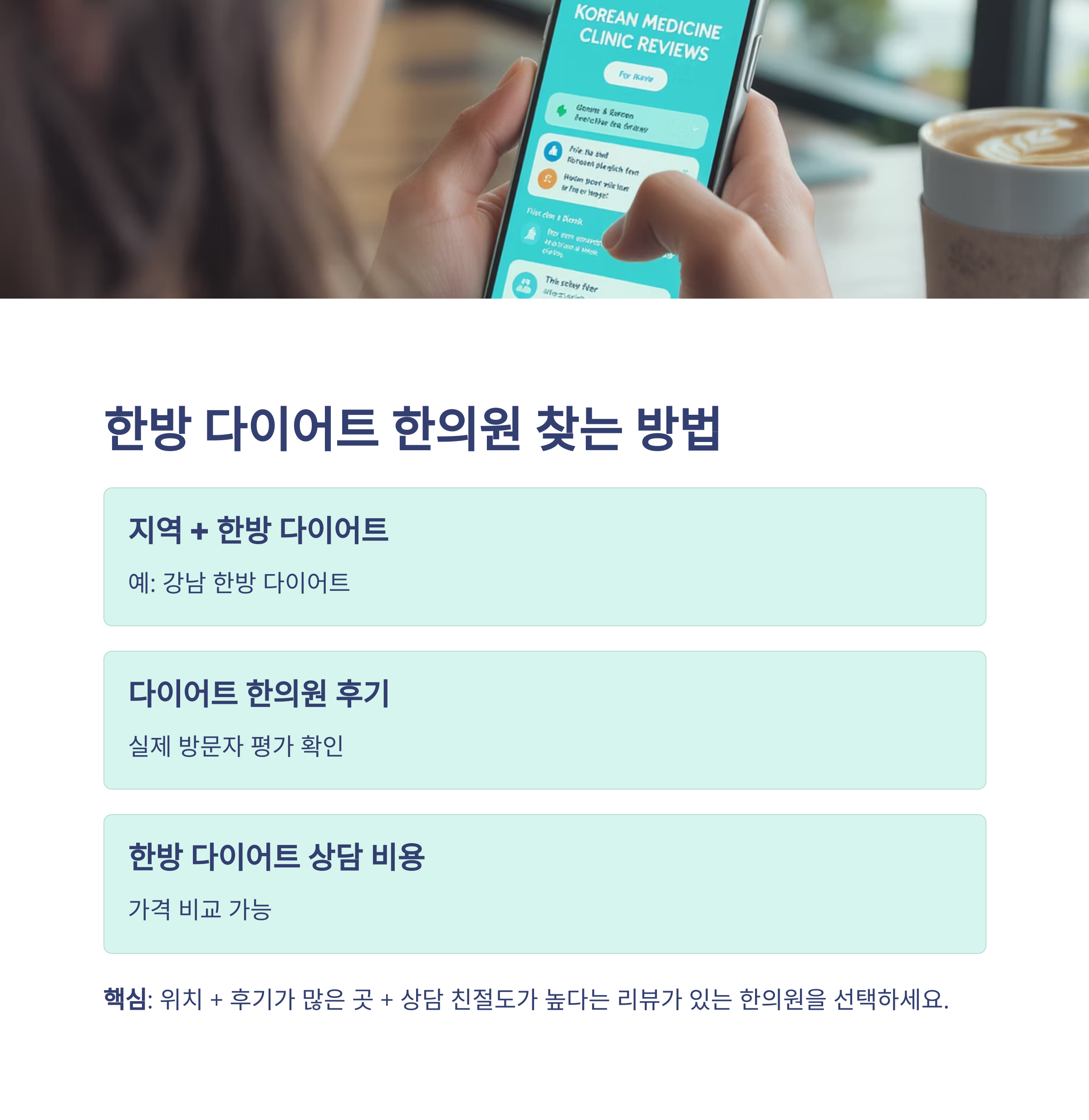 핵심: 위치 + 후기가 많은 곳 + 상담 친절도가 높다는 리뷰가 있는 한의원을 선택하세요.
