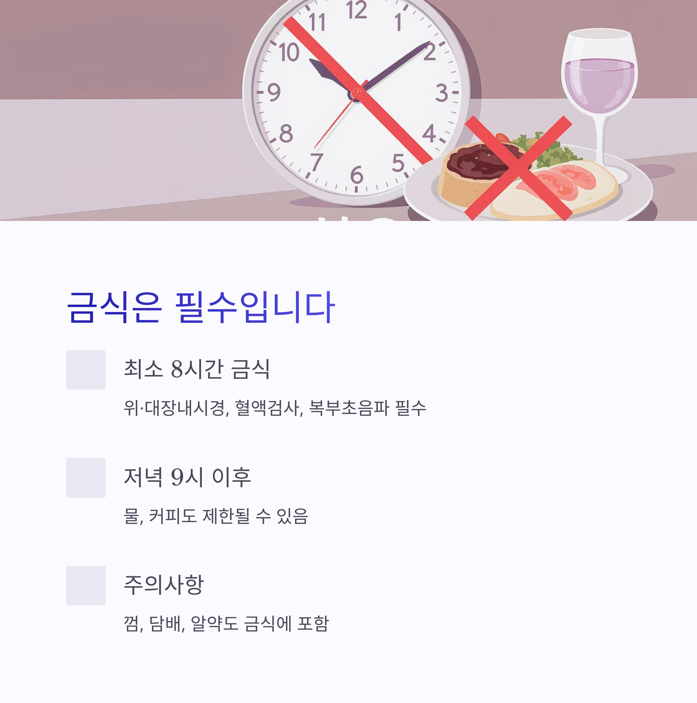 위·대장내시경, 혈액검사, 복부초음파 등 주요 항목은 최소 8시간 금식이 필수입니다.