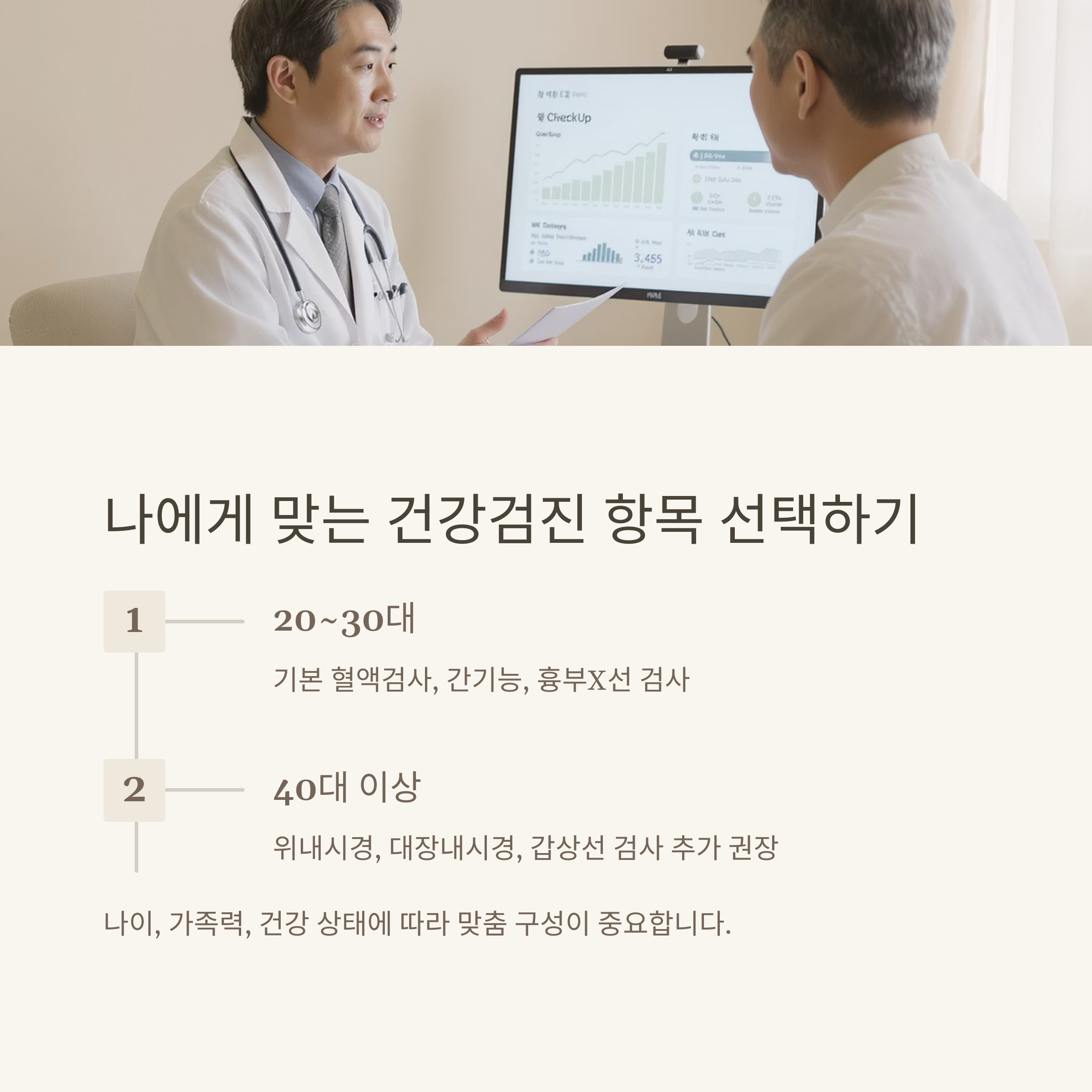 건강검진 항목은 나이, 가족력, 건강 상태에 따라 맞춤 구성이 중요합니다.