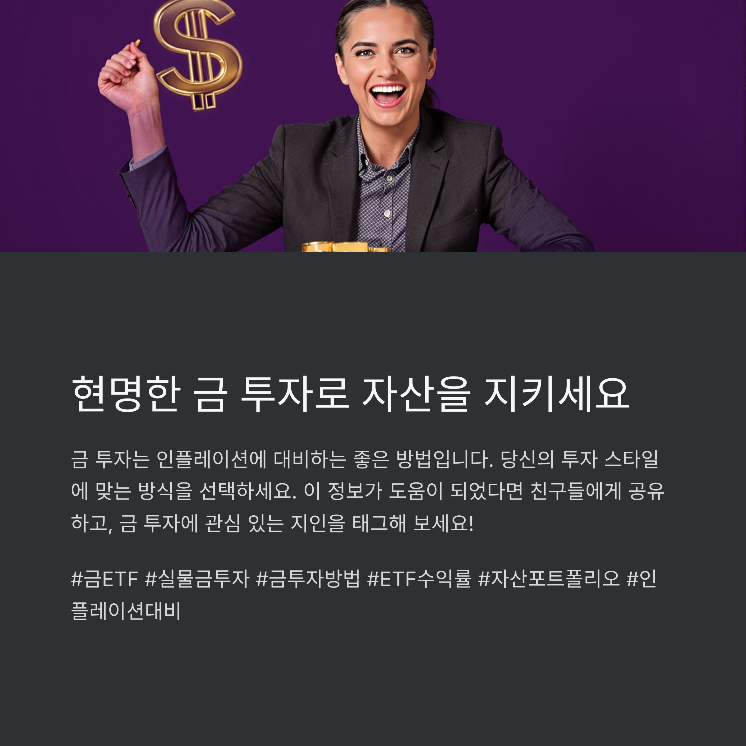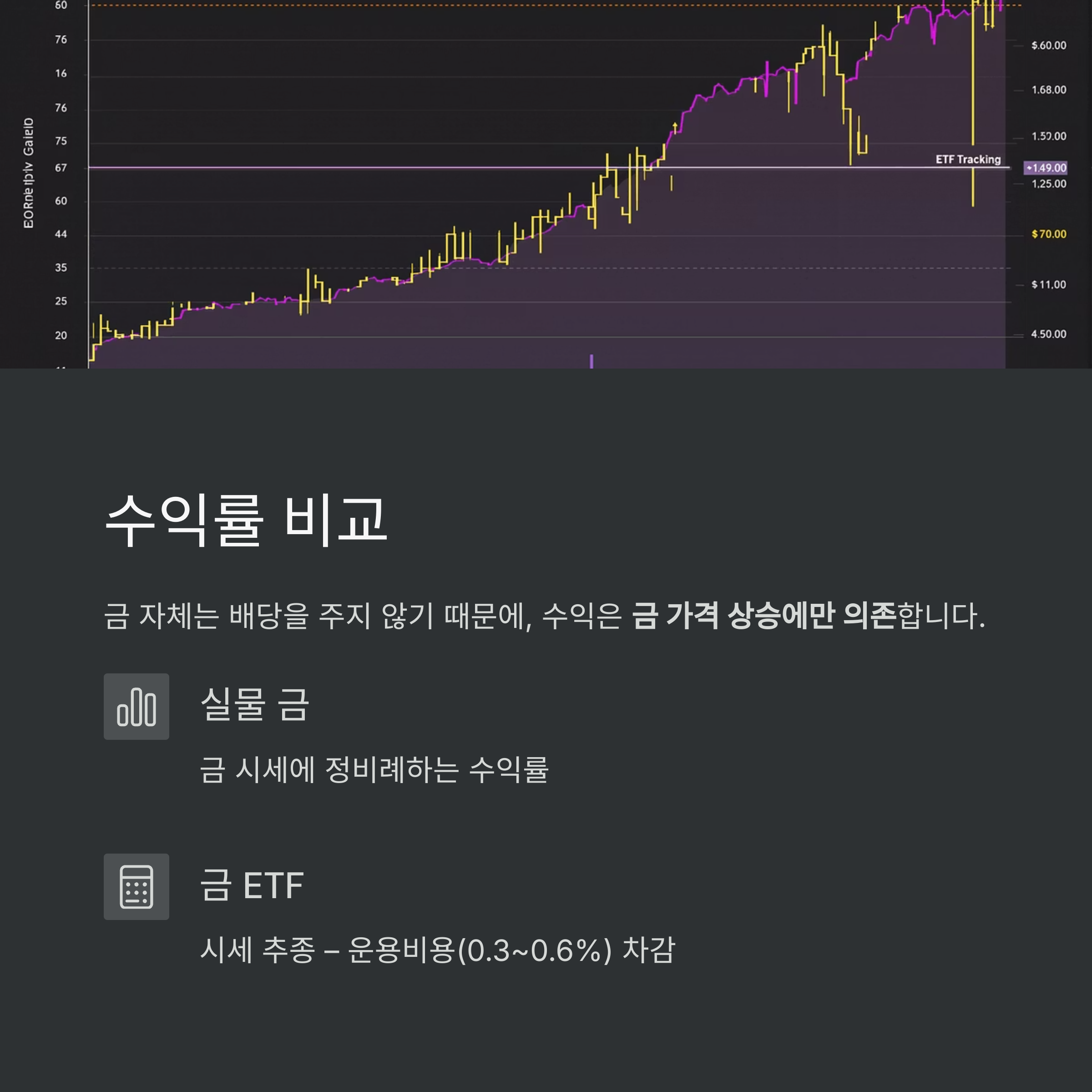 금 ETF는 이를 그대로 추종하지만, **운용 수수료(연 0.3~0.6%)**가 있어 장기 투자 시 수익률이 조금 낮아질 수 있습니다.