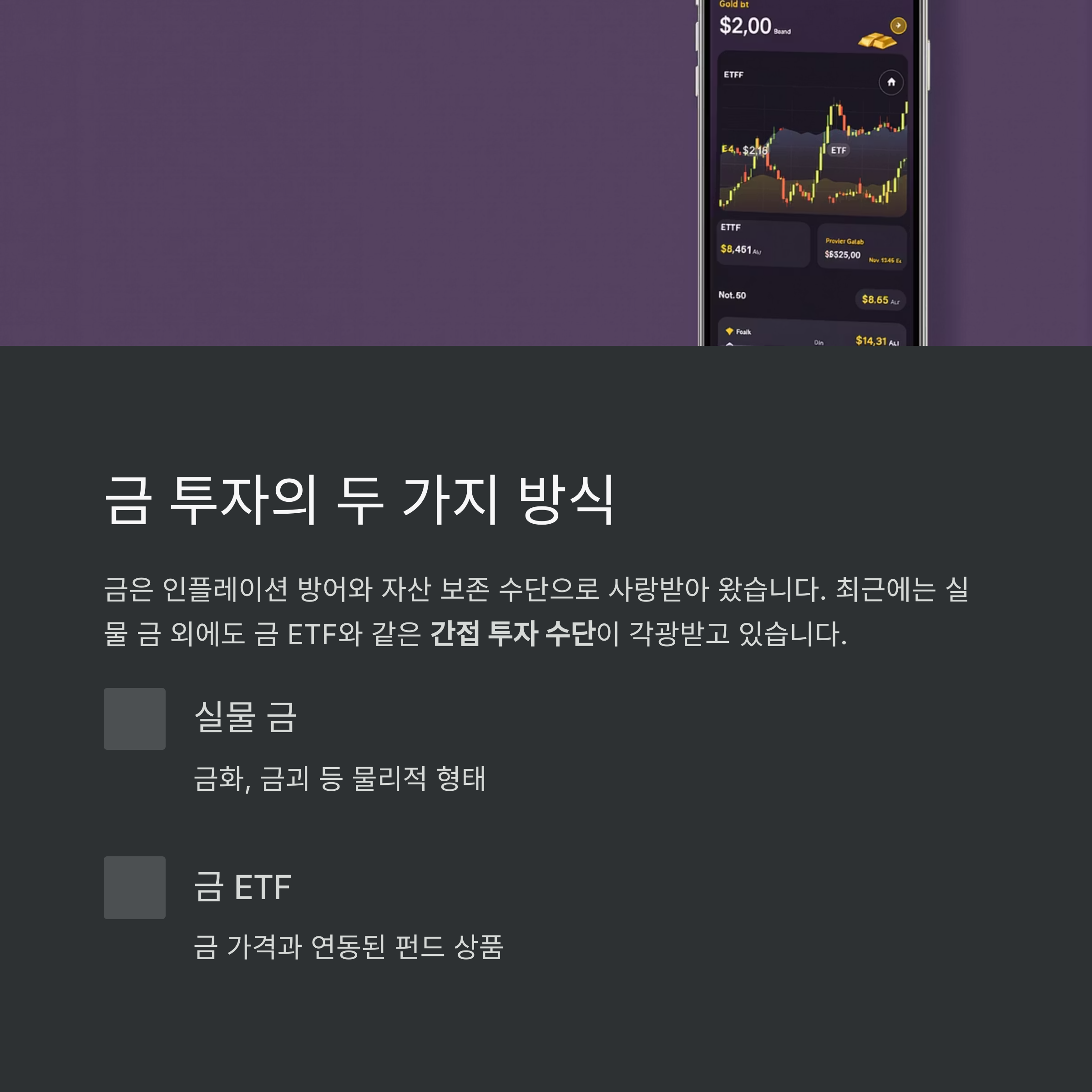 반면 금 ETF는 금 가격과 연동된 금 관련 자산에 투자하는 펀드 상품으로, 증권처럼 사고팔 수 있습니다.
