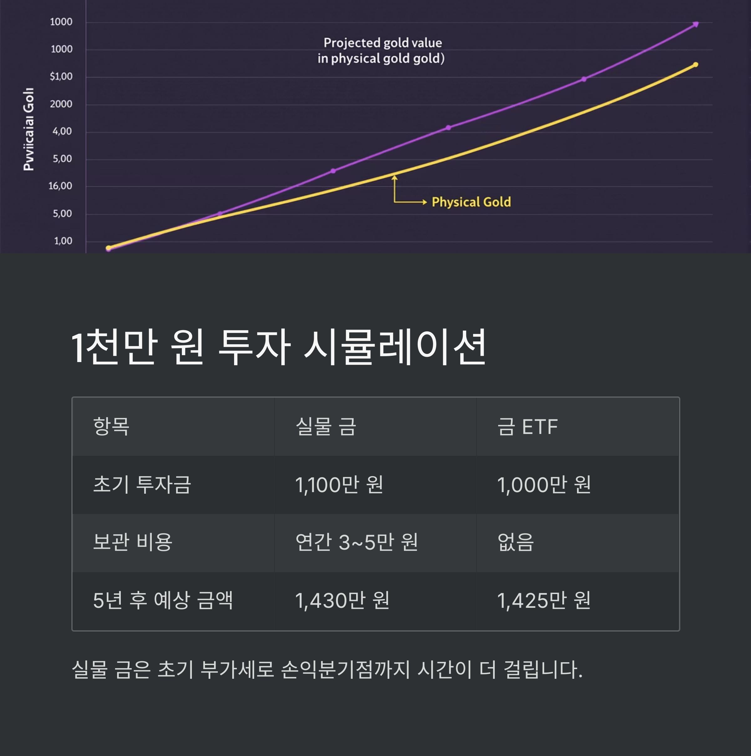 아래는 실물 금과 ETF에 1천만 원을 투자했을 때 예상되는 차이를 시뮬레이션한 표입니다.