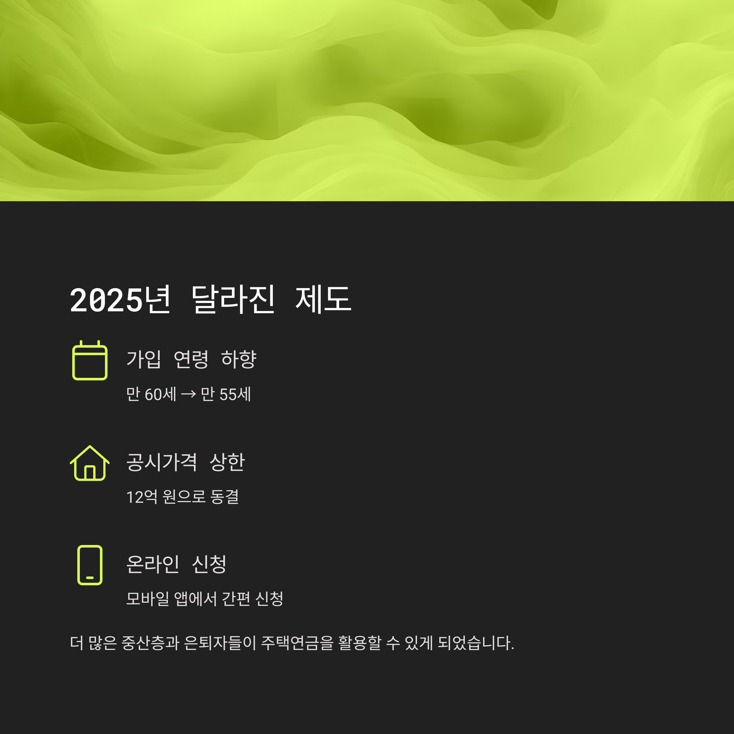 - 가입 가능 연령 하향: 기존 만 60세 → 만 55세로