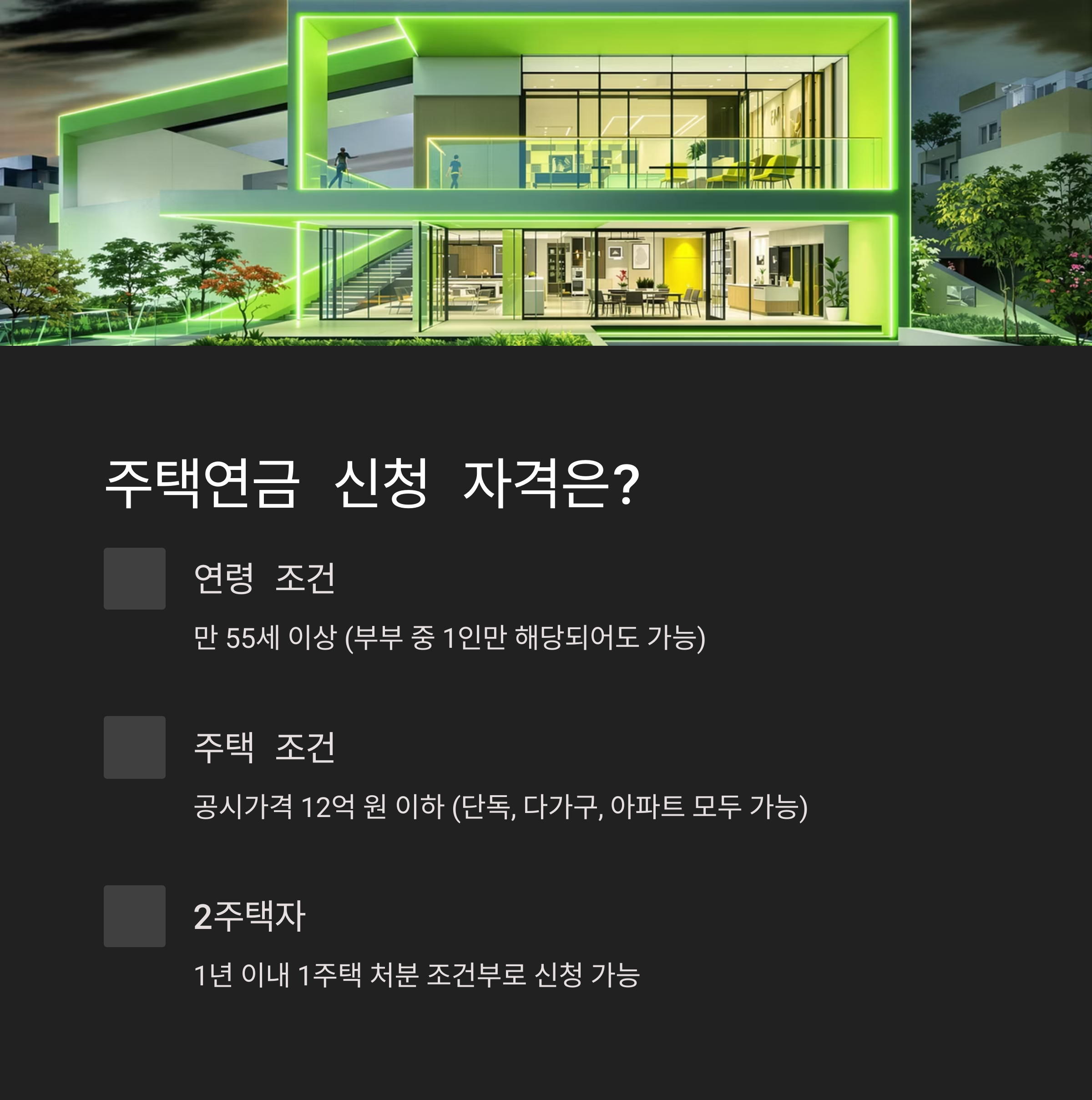 - 가입 당시 주택의 공시가격이 12억 원 이하일 것 (2025년 기준)