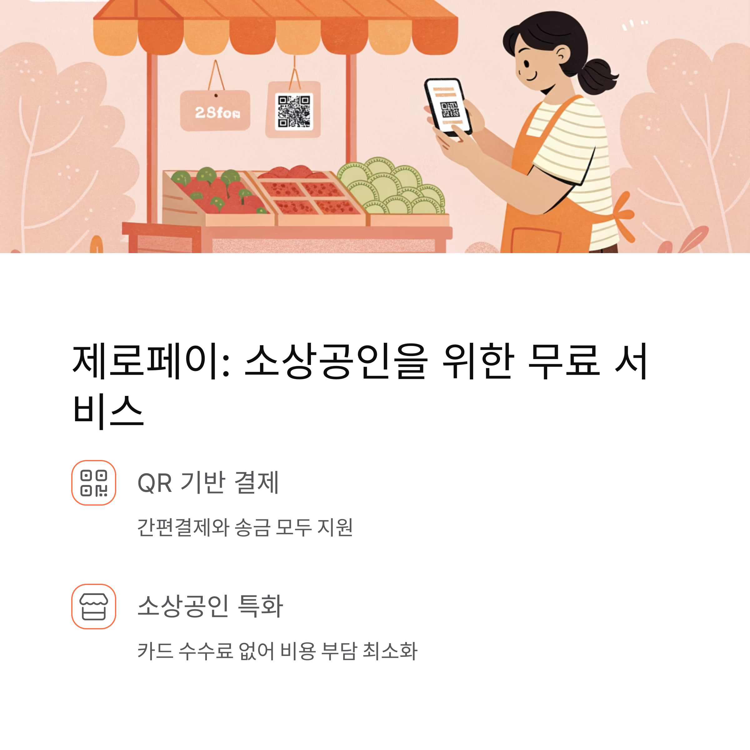 제로페이는 QR 기반 간편결제와 송금을 지원하며, 수수료가 완전 무료입니다. 특히 소상공인에게 적합한 구조로, 결제 건에 대해 카드 수수료가 없어 비용 부담이 거의 없습니다. 다만 일반 사용자는 사용 편의성 측면에서 불편할 수 있습니다.