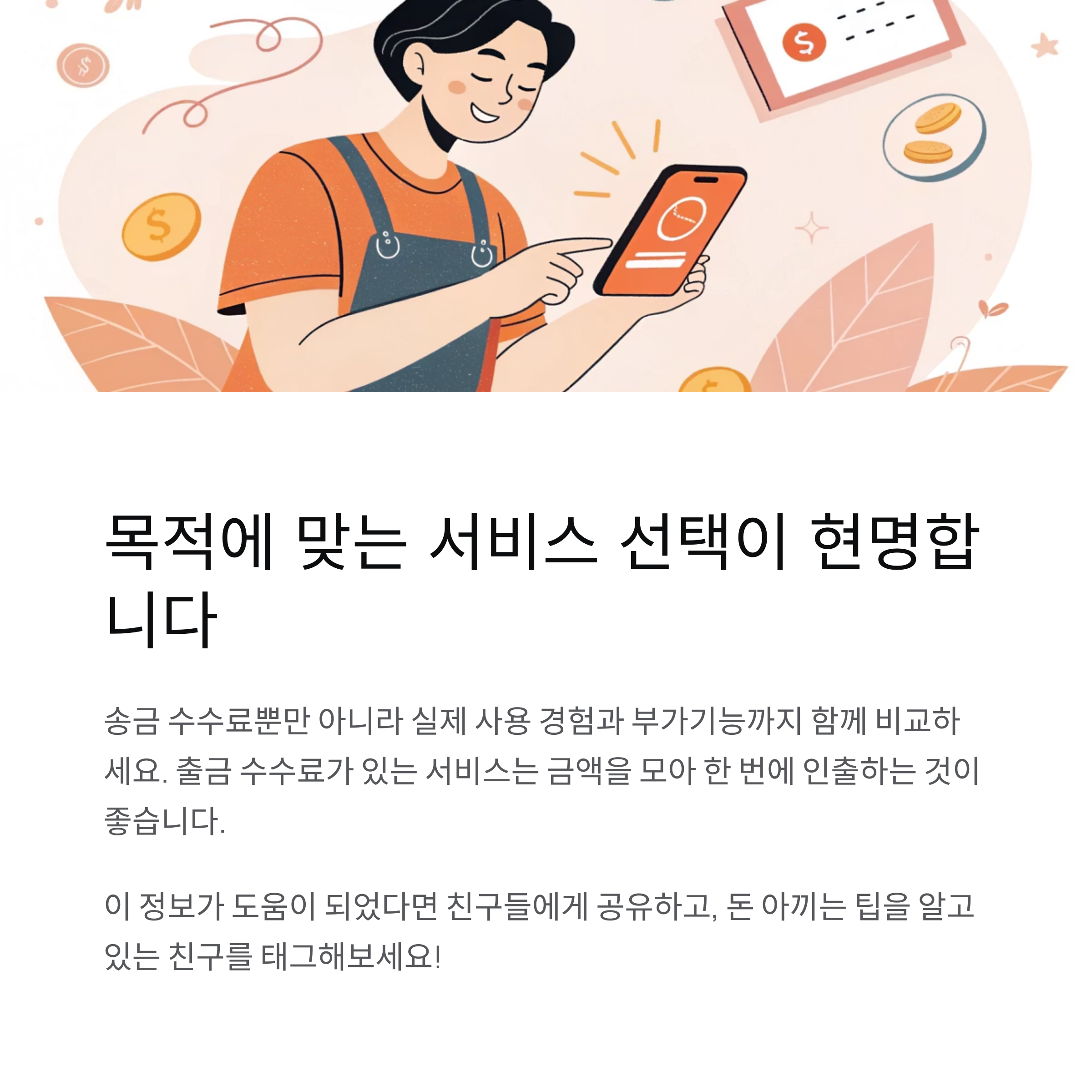 송금 수수료는 단순 비교가 가능하지만, 실제 사용 경험과 서비스 부가기능까지 함께 비교해야 후회 없는 선택이 가능합니다.