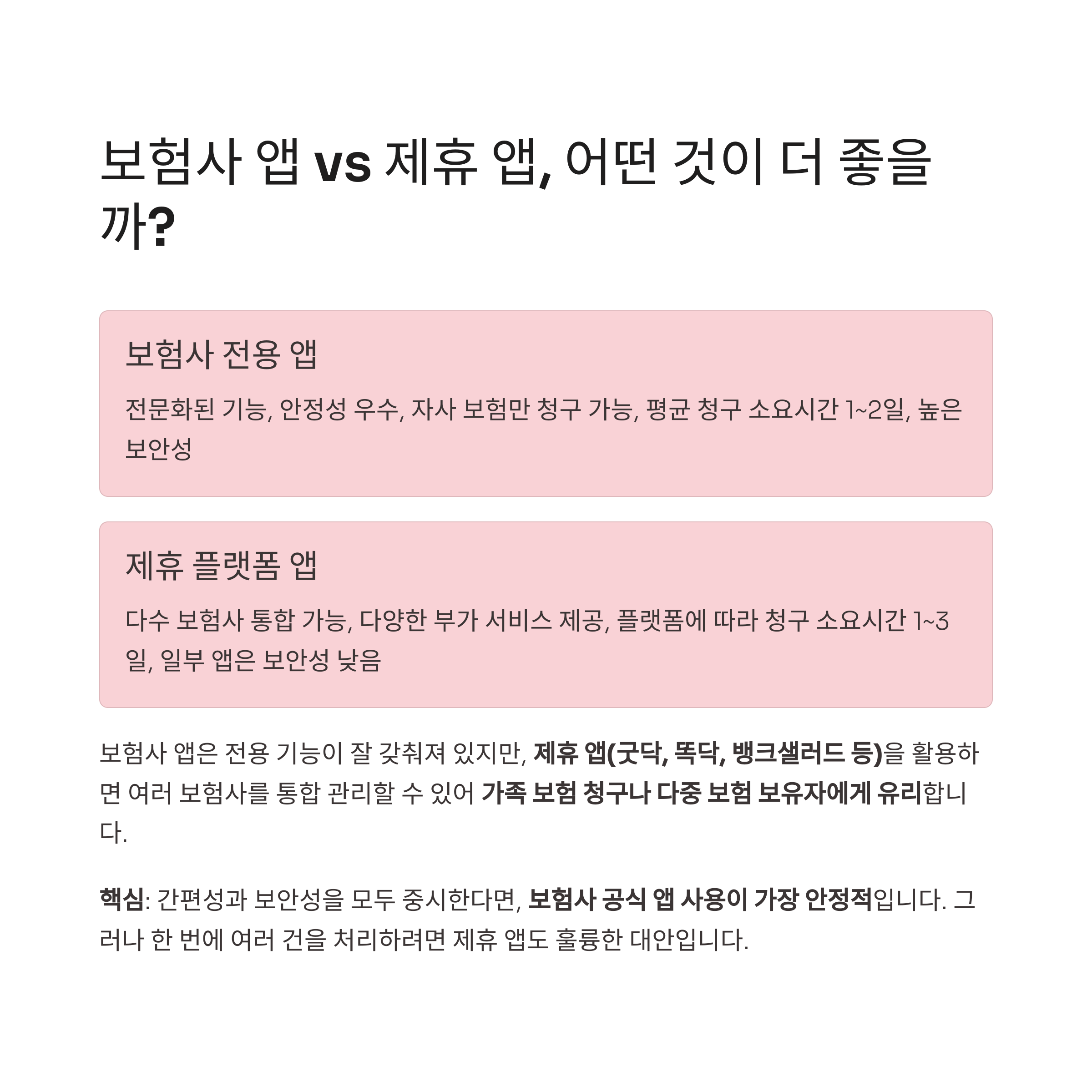 보험사 앱은 전용 기능이 잘 갖춰져 있지만, **제휴 앱(굿닥, 똑닥, 뱅크샐러드 등)**을 활용하면 여러 보험사를 통합 관리할 수 있어 가족 보험 청구나 다중 보험 보유자에게 유리합니다.