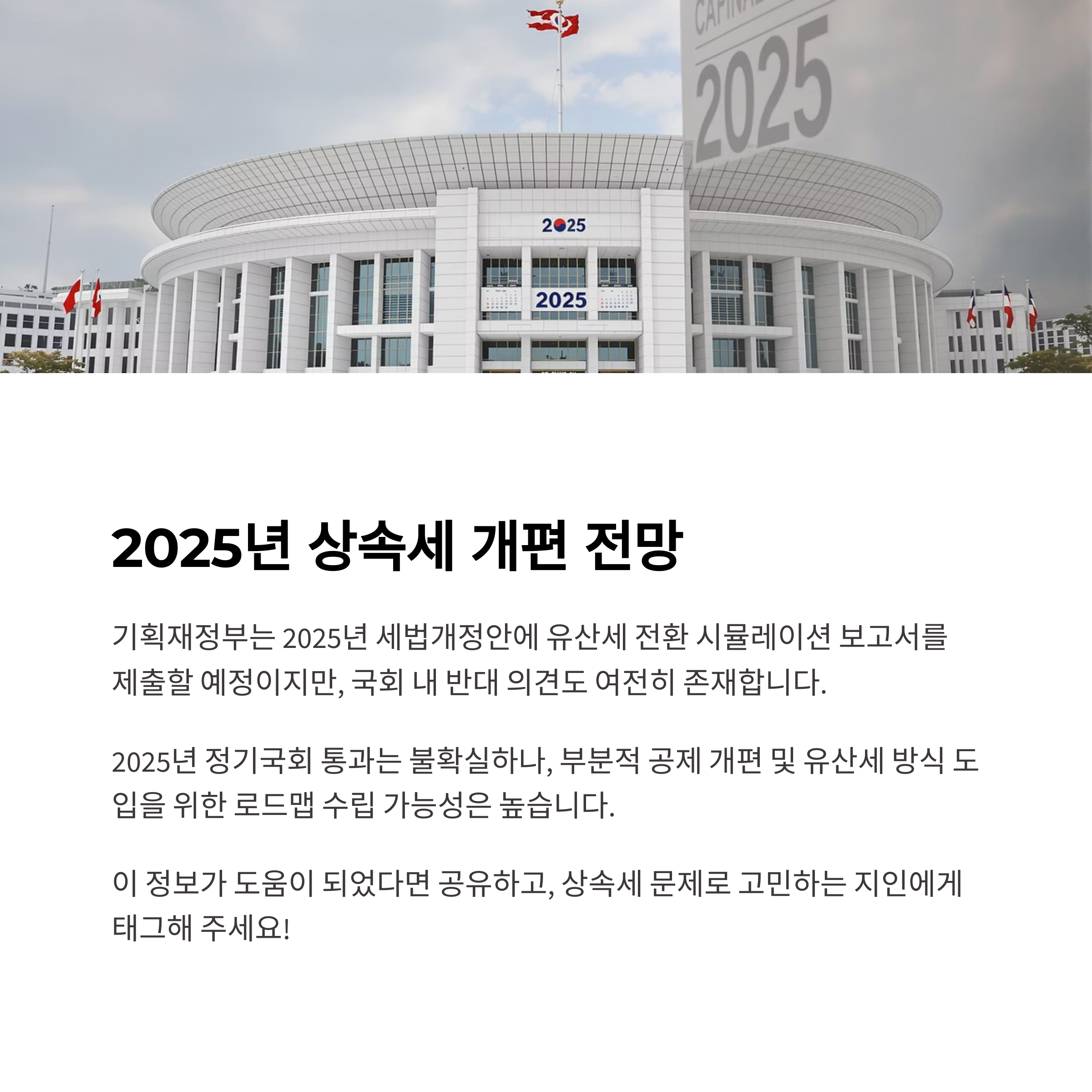 - 기획재정부는 2025년 세법개정안에 유산세 전환 시뮬레이션 보고서 제출