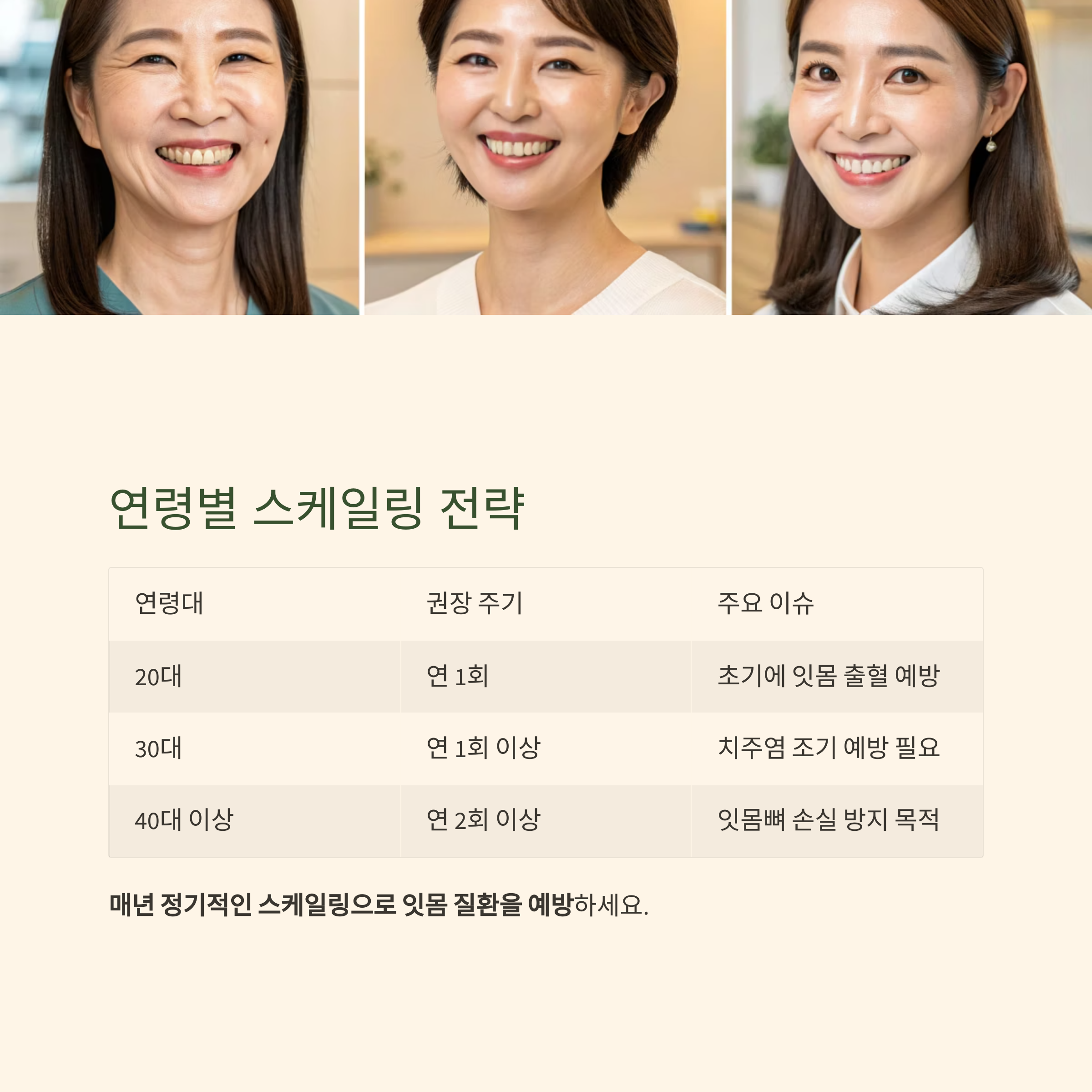 20대 | 연 1회 | 초기에 잇몸 출혈 예방 |