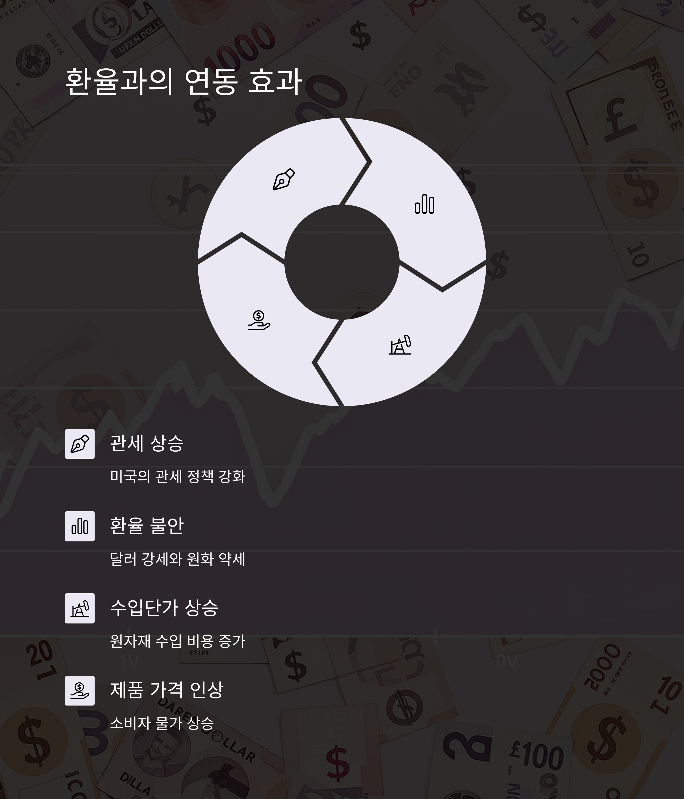 "관세→환율 불안→원자재 수입단가 상승→제품 가격 인상"